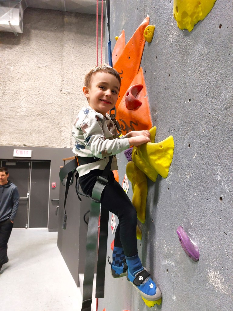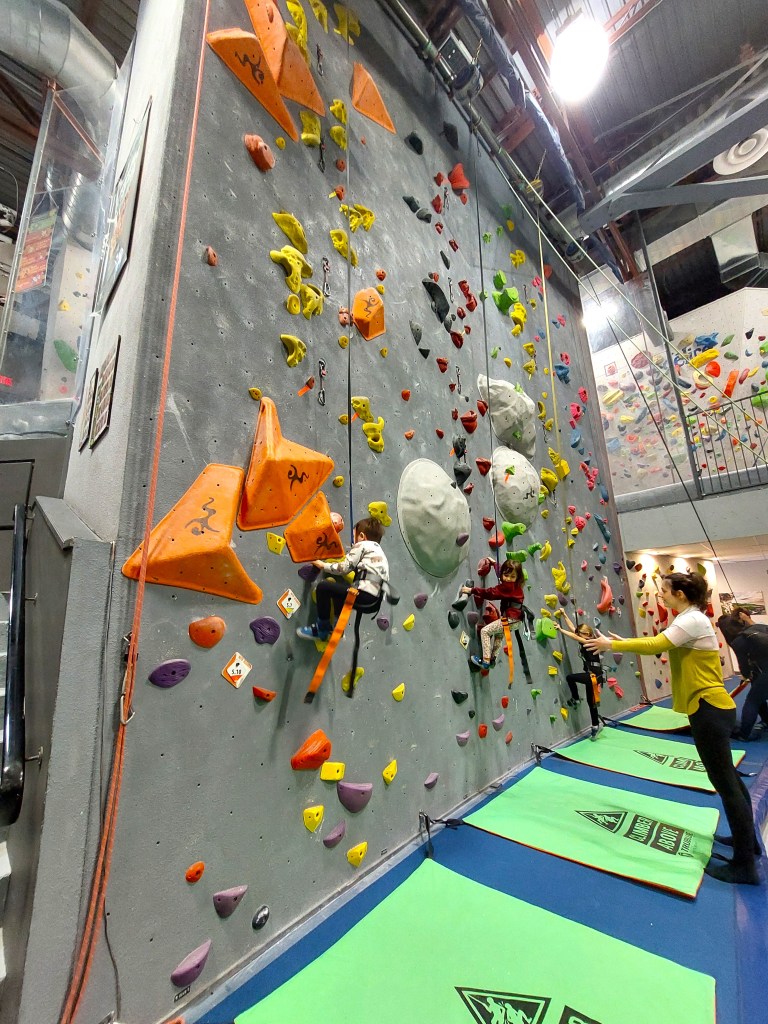 - Équipés d’un harnais bien adapté, les enfants évoluent sur le mur en toute sécurité